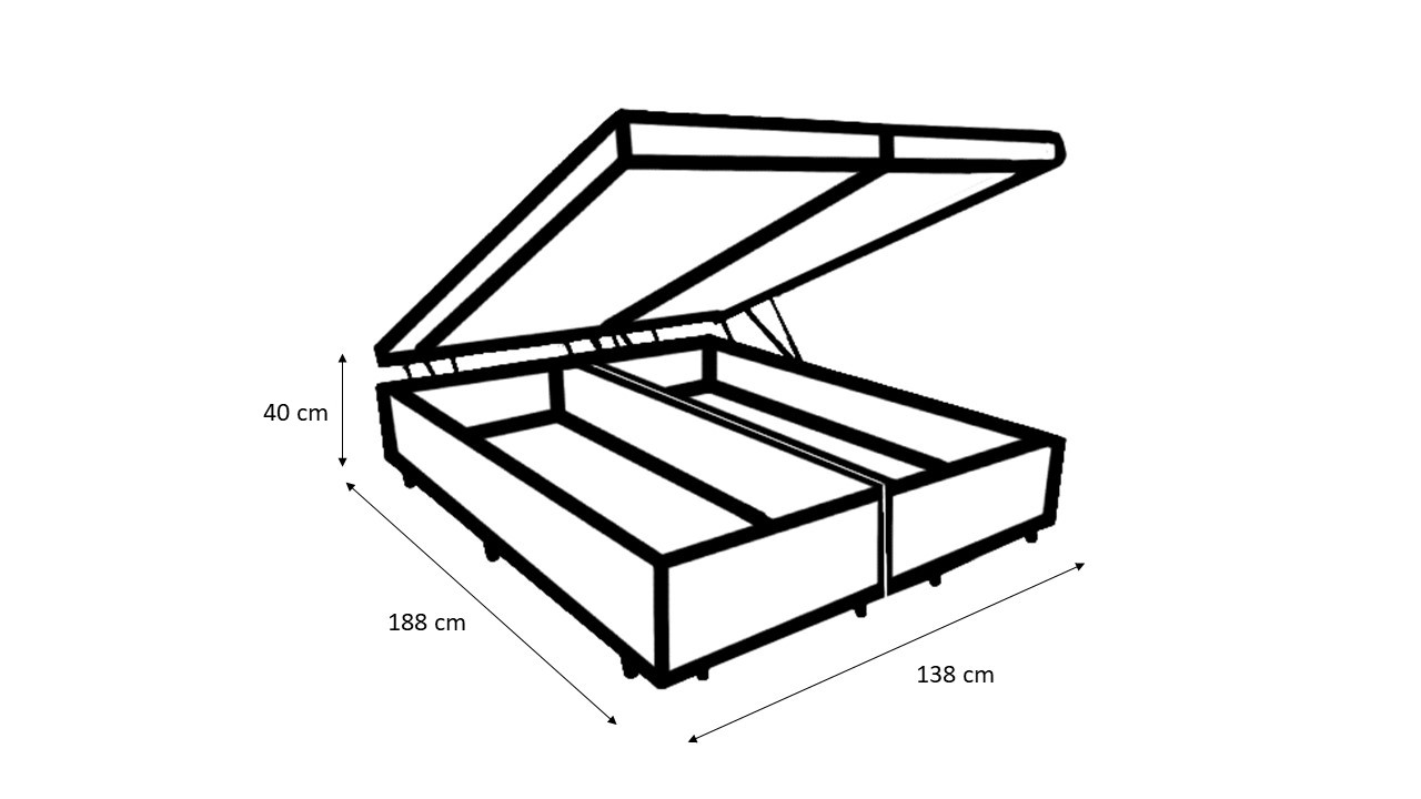 - A Cama Box Baú Casal é perfeita para todas as pessoas precisam de uma cama grande e espaçosa, mas sofrem com o problema de a cama não passar na porta: Esse problema foi resolvido com a nova cama Bi-partida casal. Funciona da seguinte maneira: E cama com dimensões de 138x188x40cm é composta de duas camas com dimensões 69x188x40cm e assim as duas partes são conectadas. Desse modo, torna-se muito mais fácil mover a cama e passar por áreas pequenas como portas, corredores e escadas. Assim que for colocada em seu lugar definitivo, por meio de uma junção elas são conectadas e formam assim uma só cama casal nas dimensões Casal (138x188x40cm). Uma outra grande vantagem dessa cama, permitindo que a roupa de cama, travesseiros, e diversos outros objetos possam ser guardados dentro da cama! Além de resistente e espaçosa, a Cama Box Baú, ainda é prática, sendo assim muito simples e fácil utilizar.